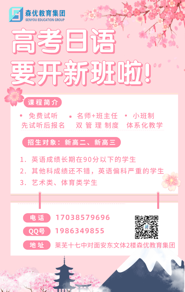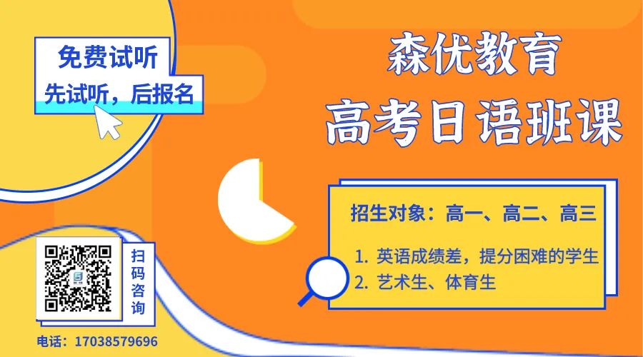 選擇森優(yōu)教育高考日語(yǔ),改變的不只是成績(jī),更可能是你的人生。徘徊千次不如選擇一次!給自己一個(gè)機(jī)會(huì),森優(yōu)教育助你圓夢(mèng)理想大學(xué)!